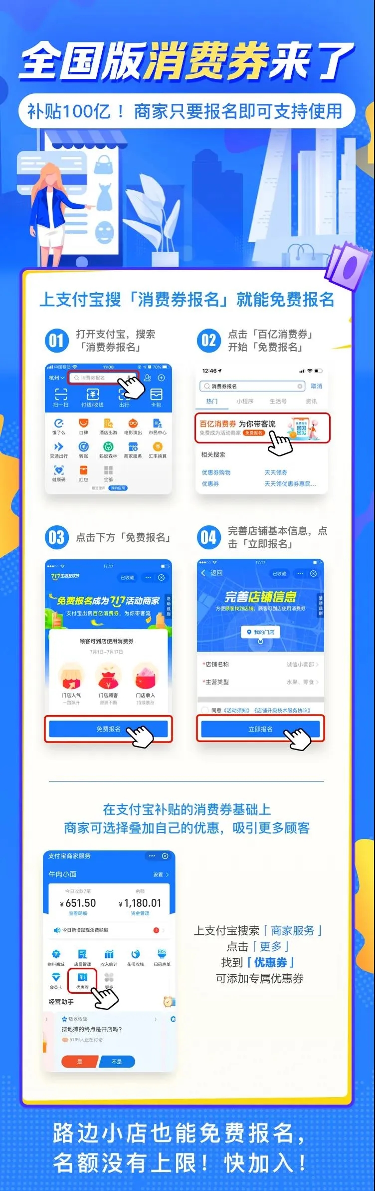 目前,支付寶全國版消費券正廣泛接受商家報名。全國商家只要在支付寶搜索“消費券報名”,完成報名后即可支持全國版消費券核銷。