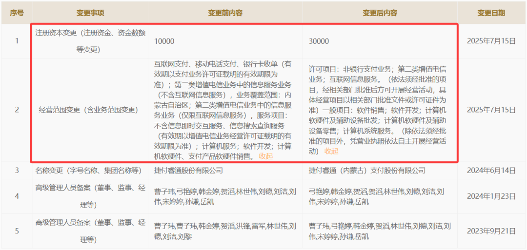 值得注意的是,捷付睿通的注冊資本也由1億變更為3億,此前,中國人民銀行內(nèi)蒙古自治區(qū)分行同意捷付睿通增加公司注冊資本時并未公布具體增資數(shù)額。