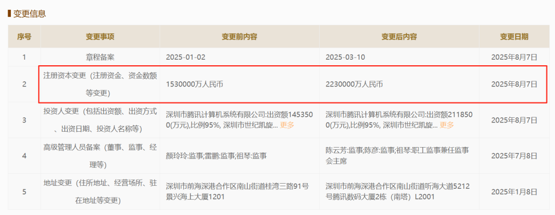 文章來源:四九八網(wǎng)絡(luò)發(fā)布時間:2025-08-12 09:09:33熱度:194據(jù)國家企業(yè)信用信息公示系統(tǒng)顯示,財付通支付科技有限公司于2025年8月7日完成注冊資本變更,從153億元增至223億元,增幅達(dá)45.75%。
