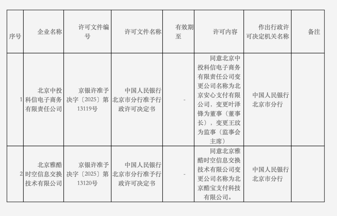 文章來源:四九八網(wǎng)絡(luò)發(fā)布時間:2025-11-21 08:11:05熱度:71近日,中國人民銀行北京分行同意,北京中投科信電子商務(wù)有限責(zé)任公司變更公司名稱為北京安心支付有限公司,變更葉澤鋒為董事(董事長),變更王玟為監(jiān)事(監(jiān)事會主席);